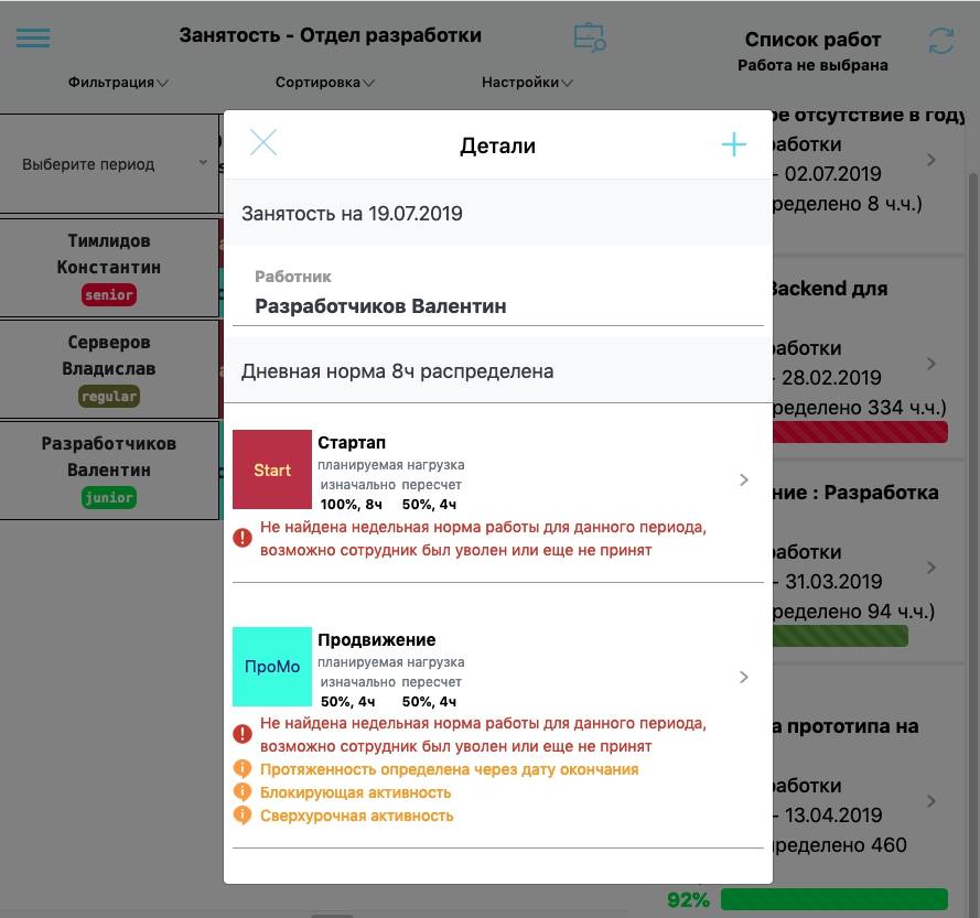 Для того чтобы система функционировала правильно, необходимо чтобы у участников проекта была выставлена недельная норма работы, в противном случае будет взята стандартная за основу и подсвечена ошибка.