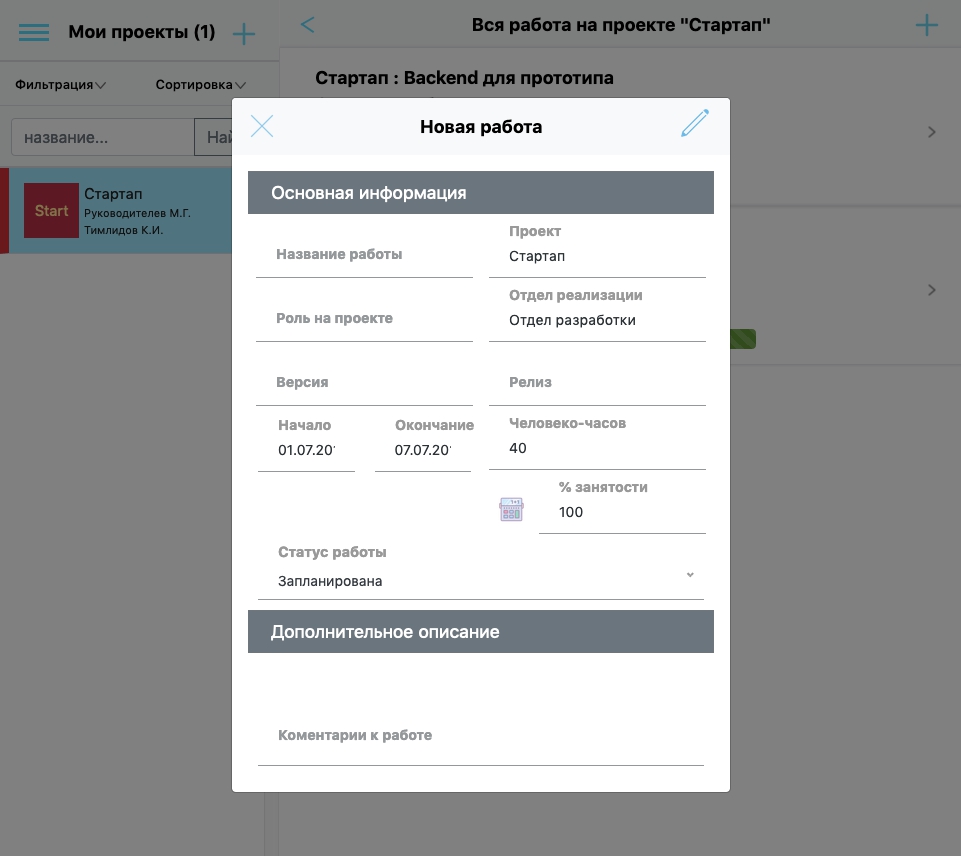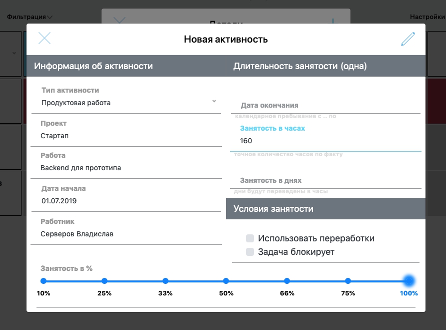Занятость в % формирует соотношение времени, которое тратиться на данный проект относительно други.