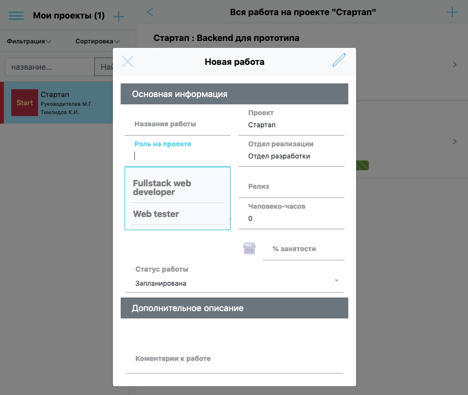 сотрудника в заданный период, вам необходимо выбрать значение "Вне работы", и тогда вам откроются проекты