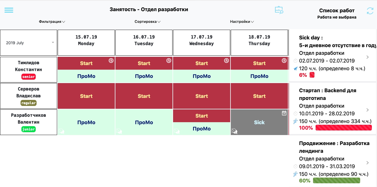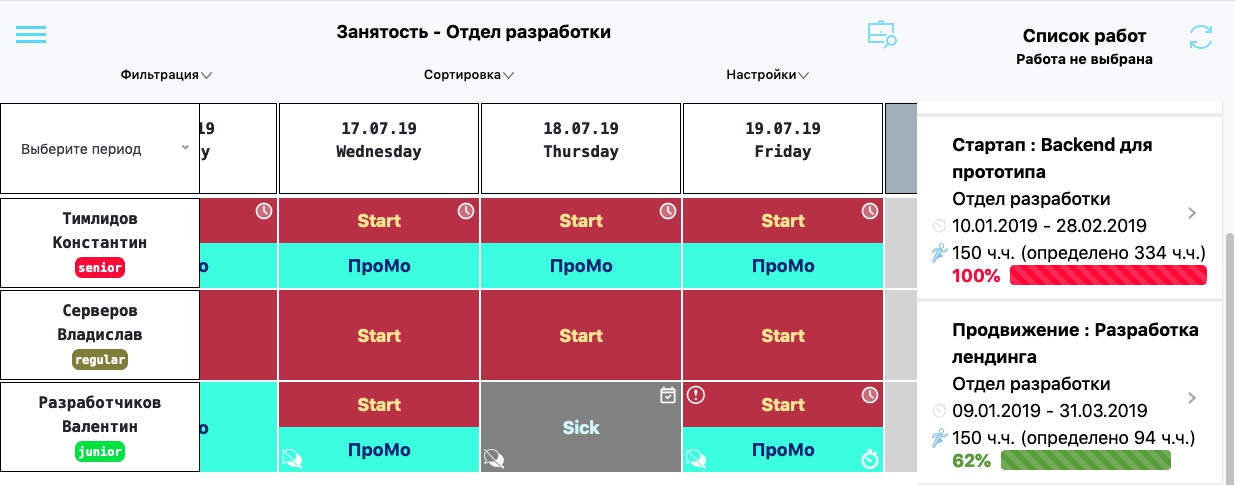 занятости отдела: кто в какие дни работает на каком проекте. Данную таблицу так же могут видеть HR, директора